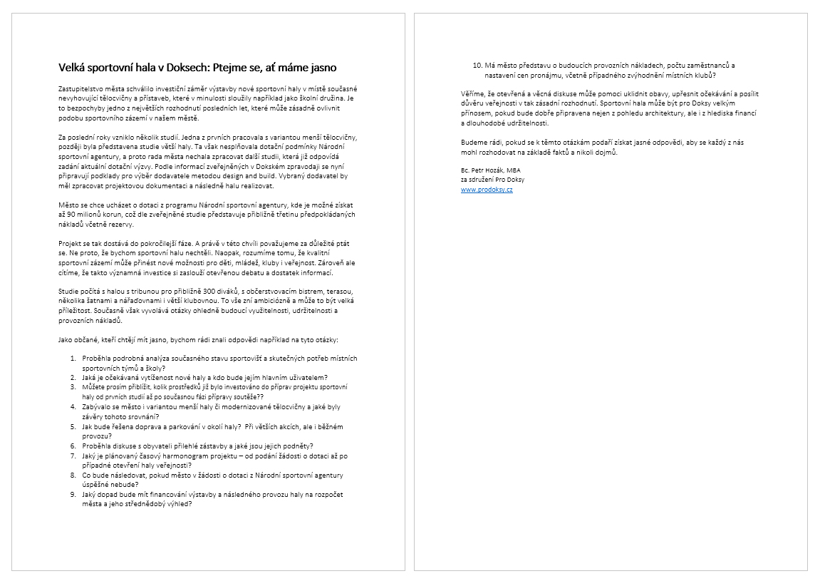 V posledních týdnech jsme připravili článek do Dokského zpravodaje, ve kterém jsme se věcně a bez emocí ptali na některé aspekty plánované výstavby velké sportovní haly.